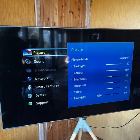 Skærmen har en ridse på 5cm, som ikke kan ses, når TVet er tændt, og et par overfladiske ovenpå skærmen.