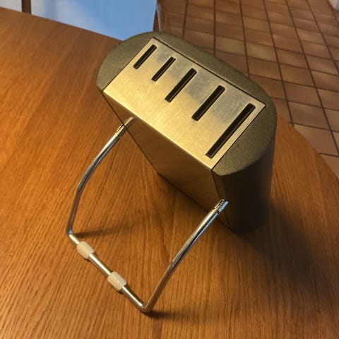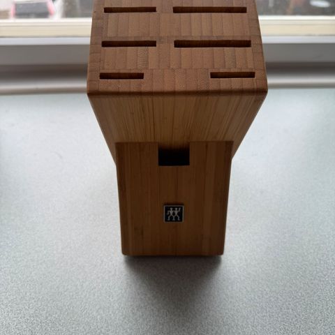 Dorre knivblok i massivt træ. Knivblokken har en åben, rektangulær form, hvor knivene placeres stående i toppen. Velegnet til opbevaring og organisering af køkkenknive på køkkenbordet. Træets naturlige årer og farvespil er synlige på alle sider, og bunden er plan, så blokken står stabilt på underlaget.