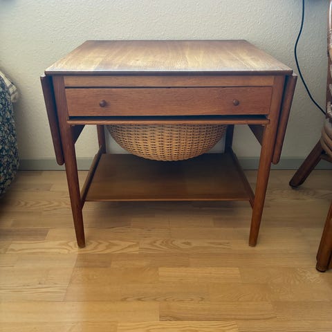 Super smukt sybord I teaktræ og fletkurv med velkørende blanke hjul.