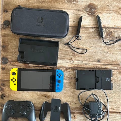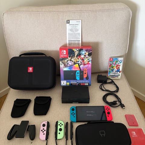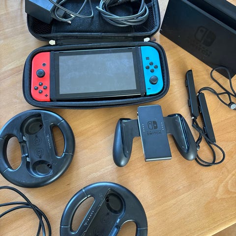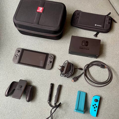 Nintendo Switch konsol med blå og rød Joy-Con controller. Sættet omfatter dock, Joy-Con greb, rat-tilbehør, håndledsremme og en beskyttende bæretaske. Der medfølger tre fysiske Nintendo Switch spil: Pokémon Let’s Go Eevee!, Nintendo Switch Sports og Mario Kart 8 Deluxe. Konsollen kan bruges både håndholdt og tilsluttet tv via docken og egner sig til både enkeltspiller og lokal multiplayer med de medfølgende controllere.