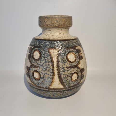 Keramikvase i brunligt stentøj med dekorativt mønster rundt om korpus. Vasen har en rund form med smallere hals og glaseret overflade i naturlige jordfarver.
