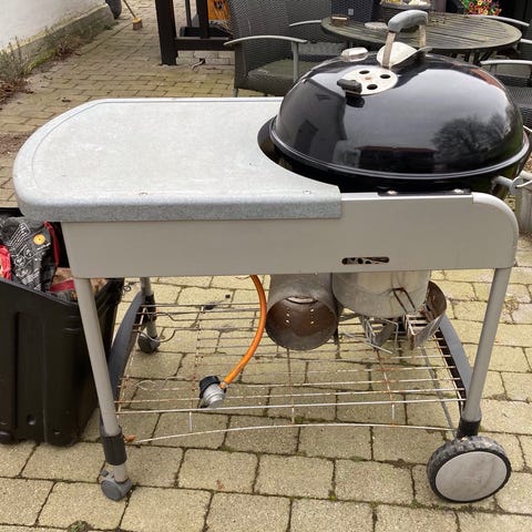 Weber Performer kulgrill med integreret sidebord og opbevaringshylde. Grillen har rund kulgrill med låg i sort emaljeret stål og indbygget termometer i låget. Der medfølger sort grillovertræk (original).