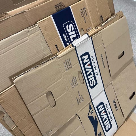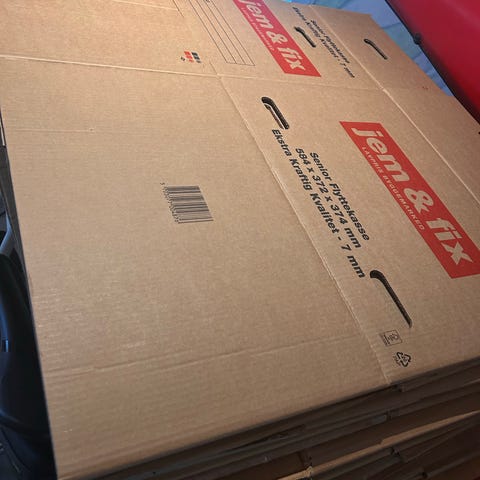 Jeg har forsøgt at tælle dem, og der er cirka 46 flyttekasser i alt, plus/minus to.