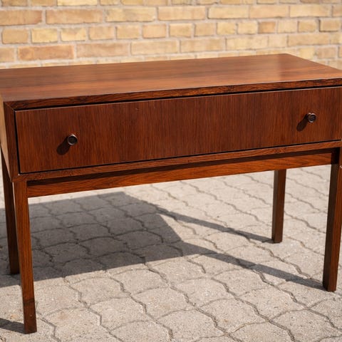 Flot kommode i teak, massivt udtryk med smukke træårer, koniske ben og fine patina-detaljer, der giver charme og karakter. Perfekt som entrémøbel, sengebord eller lille opbevaringsmøbel. God stand