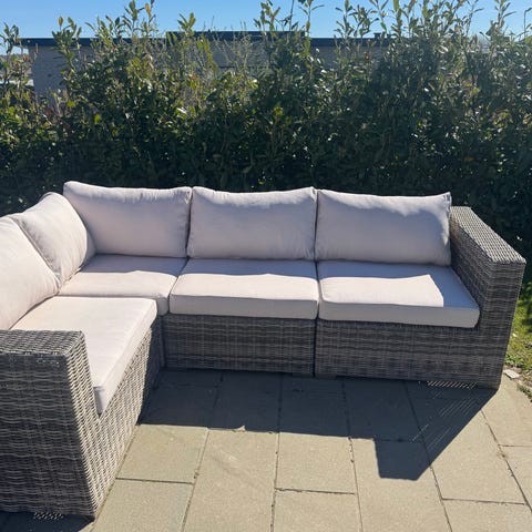 Have loungesæt bambus sofa, lænestol og bord med lyserøde hynder