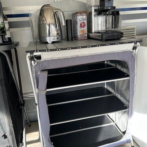 Hjemmelavet Bordplade til campingvogn i lyst krydsfinerplade er lavet til en hobby 495 ul de luxe 2023. Pladen er rektangulær og er vist monteret som ekstra arbejds- eller afsætningsplads i køkkenområdet. Egnet som udvidelse af eksisterende bord- eller køkkenplads i campingvogn