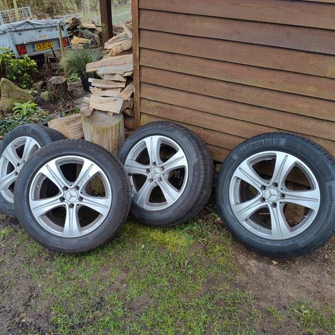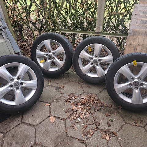 Volvo V40 original alufælge med slidte dæk - Fælgene står skarpt med lidt bremsestøv på et par af dem.