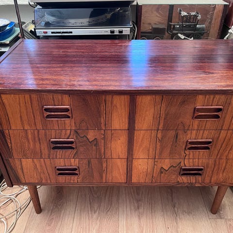 Stand: Pæn og velholdt med almindelige brugssporMateriale: Teak (finér)Design: Dansk mid-century modern