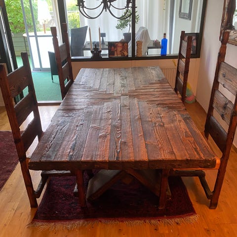 Smukt antikt bord med indlæg i bordpladen og mønster på ben.