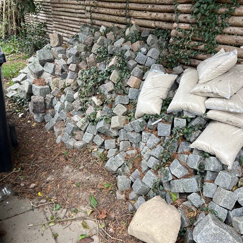 Flot gammelt granitparti bestående af brosten/chaussésten og kantsten fra eksisterende have-/udendørstrappe sælges samlet.