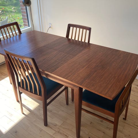 Spisebord med 6 stole og 2 tillægsplader a 50 cm. Der er plads til 12 med plader