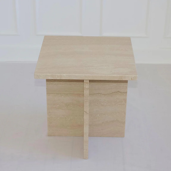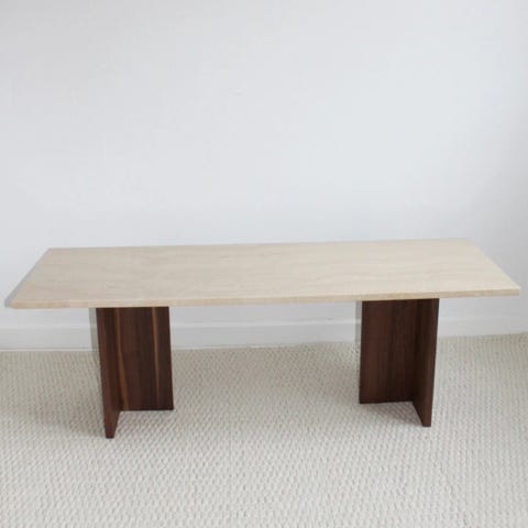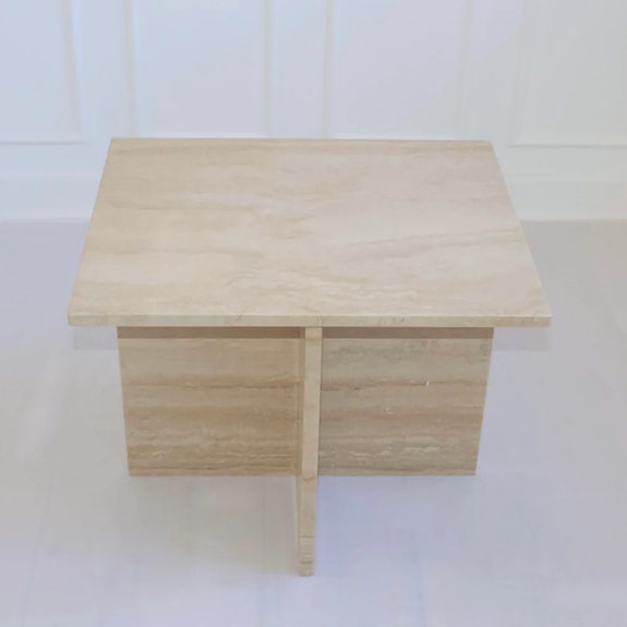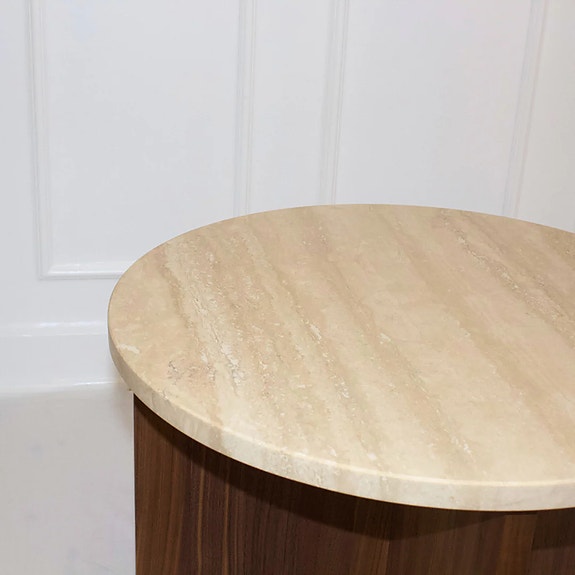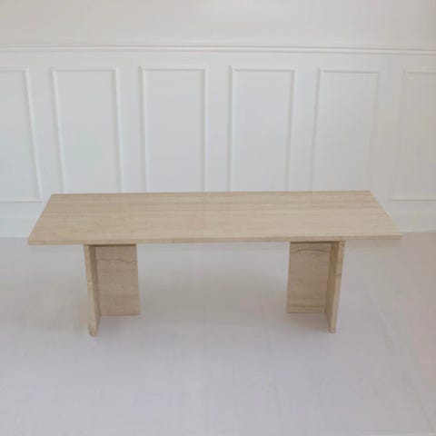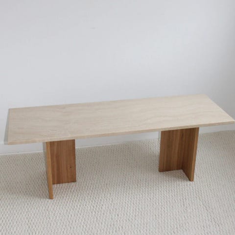 Kombinationen af en travertin bordplade og bordben skaber et udtryk, der både er råt og tidsløst.