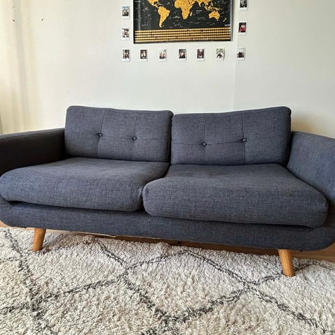 Sofa i mørkeblå med plads til 2-3 personer. Sofaen har buet ryglæn og armlæn i samme højde samt slanke ben. Egnet til stue eller mindre rum, hvor der ønskes en kompakt siddeplads. Neutralt design, der kan kombineres med forskellige typer sofaborde og indretninger.