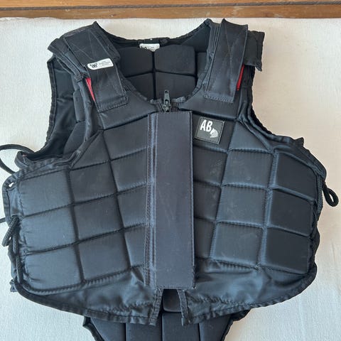 Ridevest i sort farve. Vesten har lynlås foran og paneler, der giver beskyttelse omkring bryst, ryg og sider. Den går ned foran og bagpå for ekstra dækning. Str. XS. Passer til barn fra 8 til ca 12 år