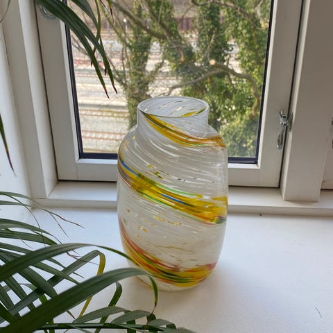 Hay vase i glas med snoede gule og hvide striber. Vasen har organisk, let asymmetrisk form med rund åbning foroven.