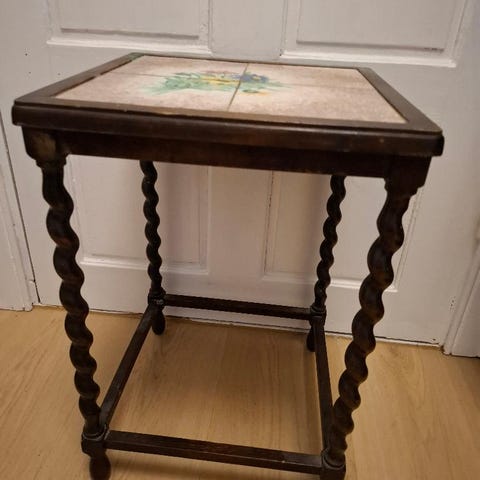 Sæt med to sideborde i træ med bordplader af keramiske fliser. Fliserne har blomsterdekoration i midten og lyse felter omkring. Bordene har drejede ben og er rektangulære. Egnet som små sofaborde, lampeborde eller afsætningsborde i stue eller entré.