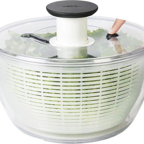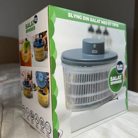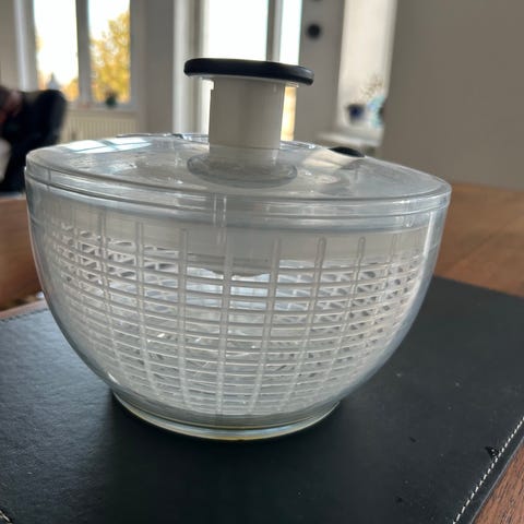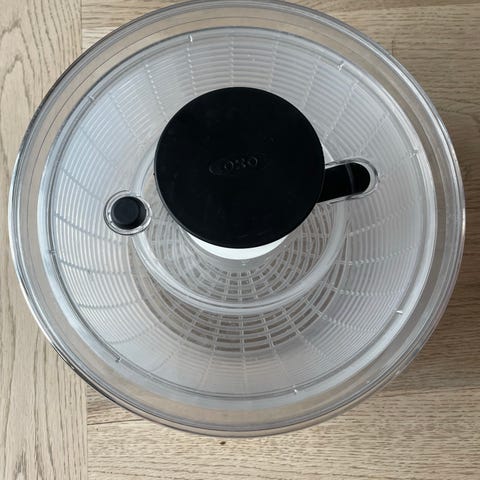 OXO Good Grips salatslynge i gennemsigtig plast. Består af skål, indsats og låg med pumpefunktion til at slynge vand af salat og grøntsager. Låget har stor sort trykknap og bremsesystem til at stoppe rotationen. Skålen kan også bruges separat som serveringsskål. Velegnet til skylning og tørring af salatblade, krydderurter og andre grøntsager i køkkenet.