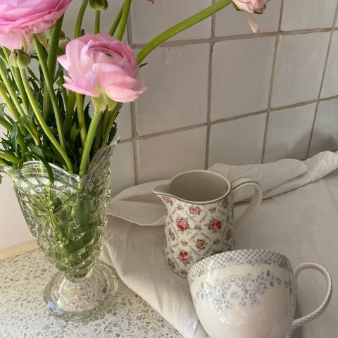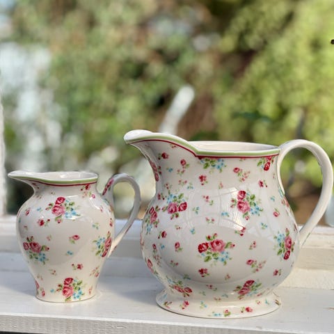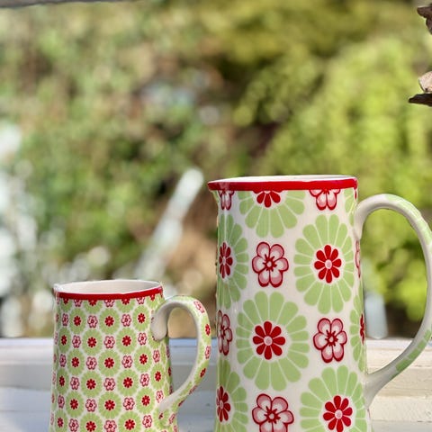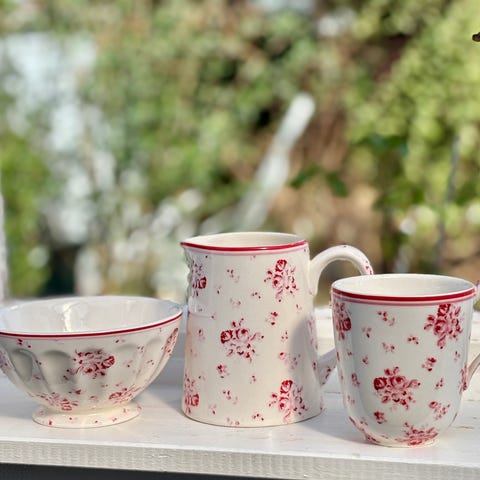 Greengate kop med hank i porcelæn. Koppen er hvid med lyseblåt blomstermønster og dekorativ kant langs top og hank. Velegnet til te, kaffe eller andre varme drikke og passer ind i service fra samme serie eller lignende romantisk/klassisk stel.