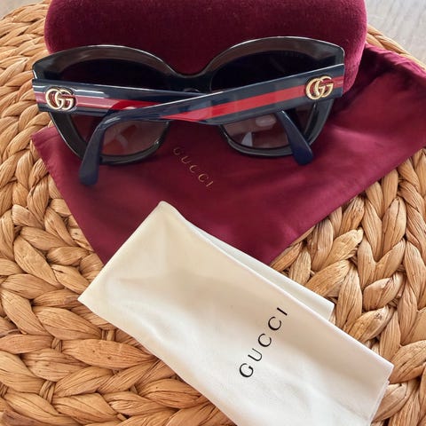 Gucci unisex solbriller med rektangulært sort stel og mørke glas. Brillestængerne er grønne med rød stribe langs siderne. Modellen egner sig til både mænd og kvinder. Medfølgende hårdt etui i blå velour med rød inderside samt blød opbevaringspose i blå stof med Gucci-logo. Prisen er til forhandling som kom med et bud