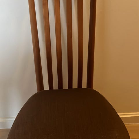 retro stol, vintage stol, spisebordsstol, rød stol, polstret stol, køkkenstol, design stol, 60er stol, 70er stol, mid century, retro møbler, stol med stof, mørke ben stol, klassisk stol, spisebord stol, dansk design stol