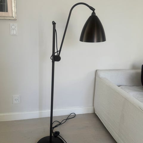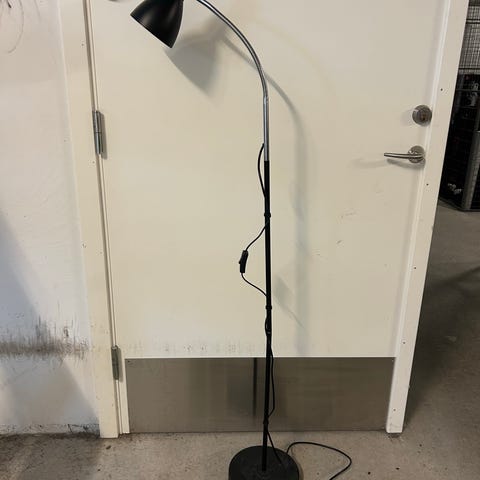 Gulvlampe i sort metal. Lampen har buet stander og rund fod, samt justerbar lampeskærm. Velegnet som læselampe eller belysning ved sofa eller stol. Bruges med standard pære med fatning, som monteres i lampeskærmen. Ledning med afbryder er placeret på standeren.