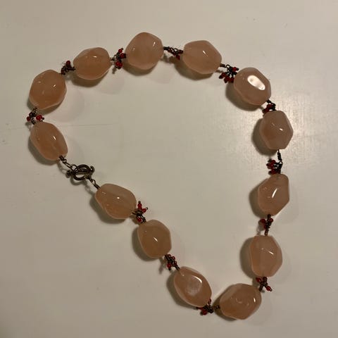 Fin retro halskæde med sten formentlig Karneol og guldfarvede perler. Den er 45 cm lang og med skruelåg.