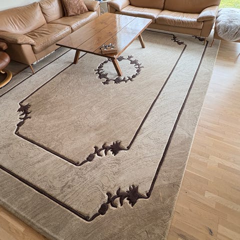 Hvis professionel rens ønskes kan Sultan tæpperens anbefales som kan hente tæppet her og levere hos jer efter rens. Tæppet er TUNGT.. har et samlet mål på 12kvm