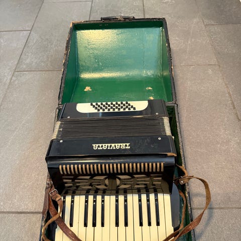 Traviata harmonika i rød perlemorsfinish med klaviatur i hvid og sort. Instrumentet har basknapper i venstre side og diskantklaviatur i højre side. Fronten er udført med metallisk gitter og dekorative guldfarvede striber. Leveres med hårdt etui, som ses på billederne.