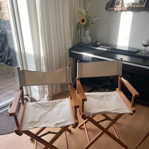 Instruktør stol i hvid træ og med sort lærredsæde. Sædet er uden brugsspor, stellet med let patina