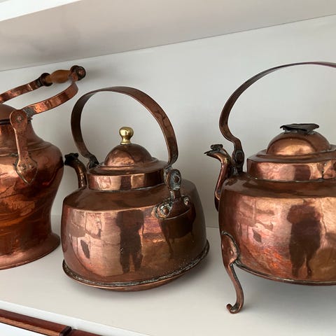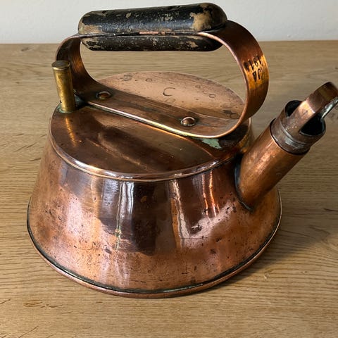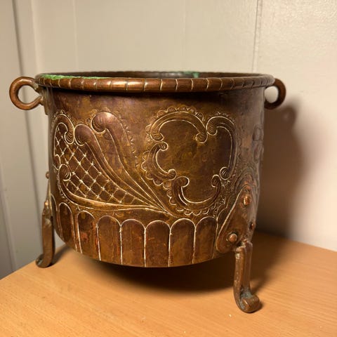 Ukendt mærke kande i kobber. Kanden har hank og hældetud samt let konisk form med bred fod. Overfladen fremstår med patina og spor af brug. Velegnet som brugskande eller som dekorativt element i indretningen.