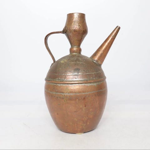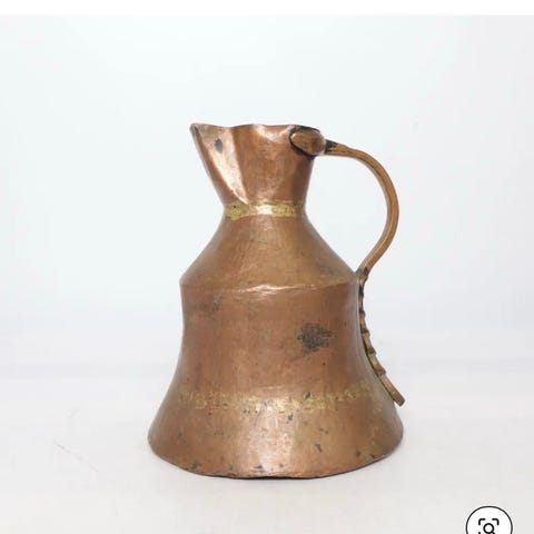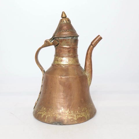 Kande i kobber med hank og låg. Overfladen har patina og synlige brugsspor. Velegnet som dekorativ genstand eller til brug, hvor en kobberkande ønskes. Ingen mærkning af producent synlig på billederne.