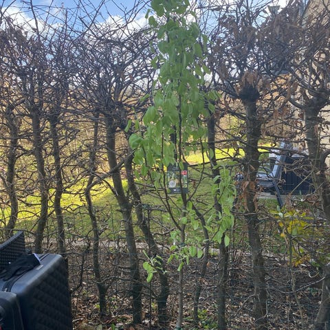 Haveplante i høj, blå keramikkrukke med dekorativt mønster. Planten har grønne, små blade på lange grene og står plantet i krukken, som kan placeres på terrasse, altan eller i have. Velegnet som prydplante i udemiljøer.