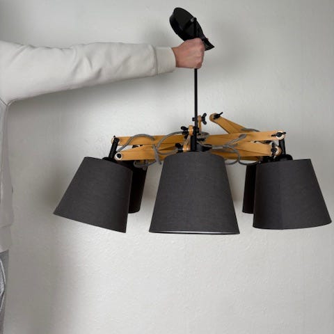 Loftlampe / lysekrone med justerbare arme i lyst træ og seks gråsorte stofskærme. De bevægelige træarme gør det muligt at justere retningen på lyset. Velegnet til ophæng i stue, spiseplads eller andre rum, hvor der ønskes flere lyskilder samlet i én loftlampe.