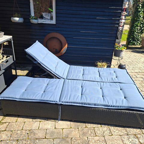 Havestol/ relaxstol / Loungestol / liggestol i polyrattan med tilhørende hynde. Stole har højt ryglæn med knapdetaljer og integreret udtrækkelig fodstøtte, så de kan bruges både som almindelig stol og liggestol.