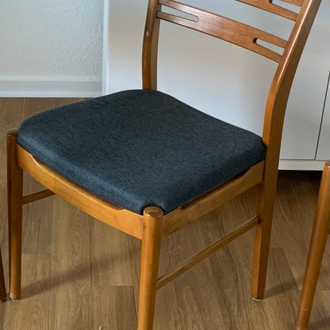 To brune spisebordsstole fra Farstrup. Slidte men velfungerende .