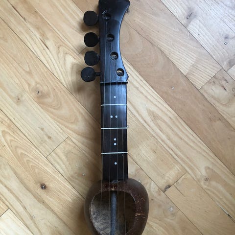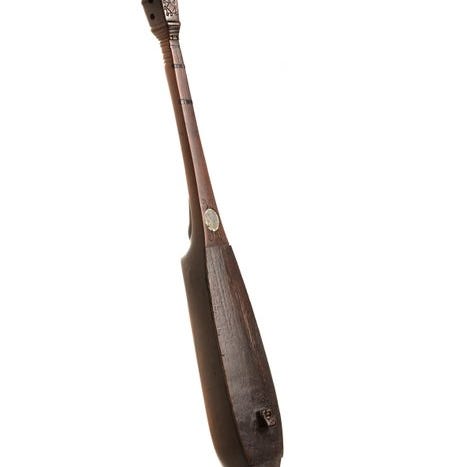 En japansk biwa 琵琶, af typen Chikuzen 筑前, en traditionel firestrengs lut med 5 frets, traditionelt brugt til fortællende og poetisk fremførelse.