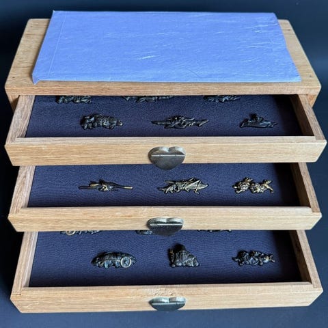 Skuffefrontene er fremstillet af solid keyaki (zelkova – japansk ‘egetræ’), og rammen af oprindeligt sugi (cedertræ), lakeret i en mørk rødbrun farve der stadig viser den flotte naturlige træstruktur.