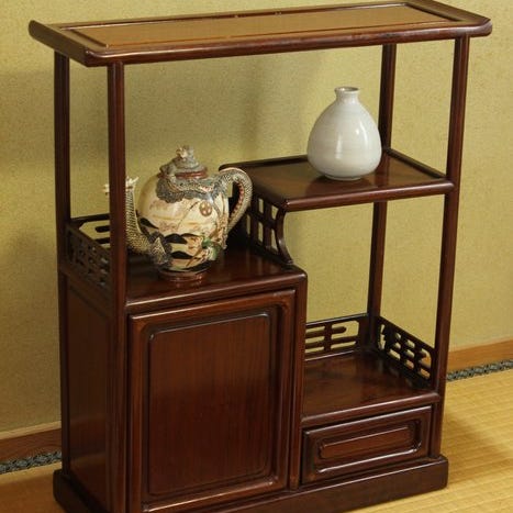 Skabet er designet med en variation af skydedøre, hældedøre og skuffer, hver dekoreret med paneler lakeret i guld, der forestiller fugle, insekter og blomstrende planter. Baggrunden bag de forskudte hylder viser en detaljeret landskabsscene med bjerge, pine træer og både, der flyder på vandet. Siderne og toppen er ligeledes dekoreret med landskabsmotiver.
