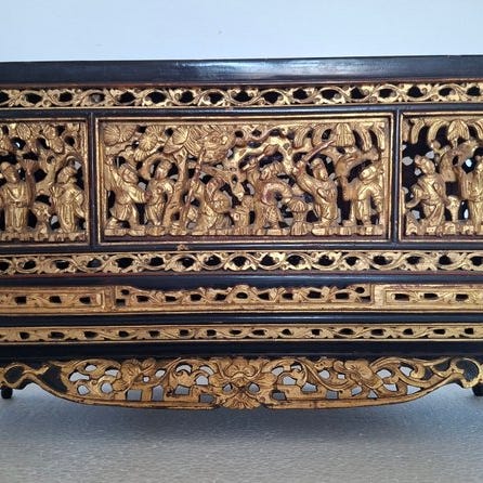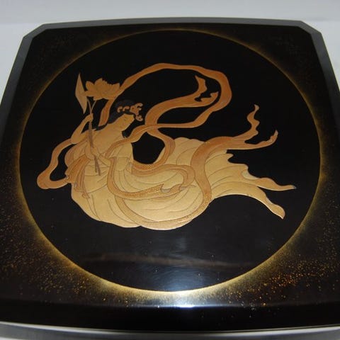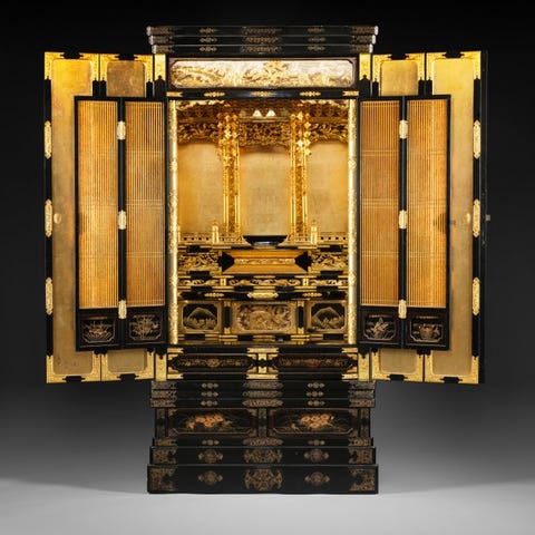 En udsmykket lakeret shodana 書棚 (bogudstillingsskab) med fod, rigt pyntet med gylden lak.
