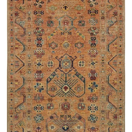 Dette smukke håndknyttede designer-tæppe i traditionelt Kazak-mønster overbeviser med sin varme farvekomposition, præcise mønsterdetaljer og den enestående håndværkskunst. Det harmoniske samspil af røde-, oker-, blå- og grønne nuancer giver tæppet en levende, men afbalanceret udstråling.