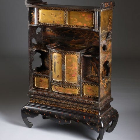 Meiji-periodens Ko’dansu lille skab fra Japan, 51,2 cm høj, 66 cm bred, 36,2 cm dyb, lavet af kiri- og sugi-træ med jern- og messingbeslag, seks skuffer med jernlåse og mokkô-håndtag, original/officiel ægthed, fremragende stand, ingen nøgle; et certifikat for ægthed medfølger ved afsendelse. Klik på den blå "gå til varen" knap, for at købe eller byde på denne vare. Den samlede pris vil blive vist inden du afgiver dit bud.