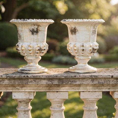 To vintage smedede jern-krukker fra Belgien, dateret 2020 eller senere, cirka 23 cm høje, 57 cm brede og 30 cm dybe, i fremragende stand. Klik på den blå "gå til varen" knap, for at købe eller byde på denne vare. Den samlede pris vil blive vist inden du afgiver dit bud.
