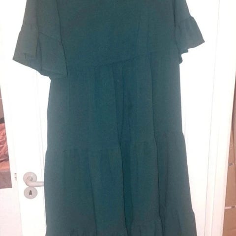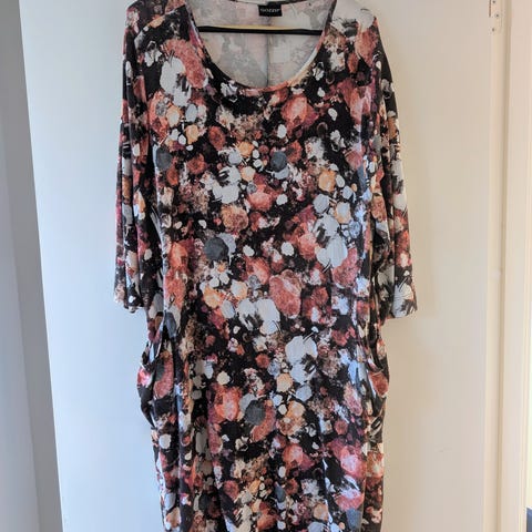 Fremstår som ny og i lækker stræk (viskose/elastan inderst og polyester yderst) svarer til storpige str M 46/48 med et bm på 2x60 cm, 104 cm lang og med fine detaljer.