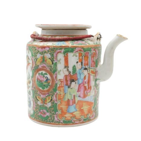 Meiji-æra Satsuma tekande i fin fajance fra Japan med håndmalede figurscener, moriage forgyldning og knækket ivory glasur; højde 11 cm, bredde 15 cm, diameter 8,5 cm, vægt 315 g, fremragende generel stand med en lille afskallet rand under foden, ikke synlig i fremstillingen. Klik på den blå "gå til varen" knap, for at købe eller byde på denne vare. Den samlede pris vil blive vist inden du afgiver dit bud.