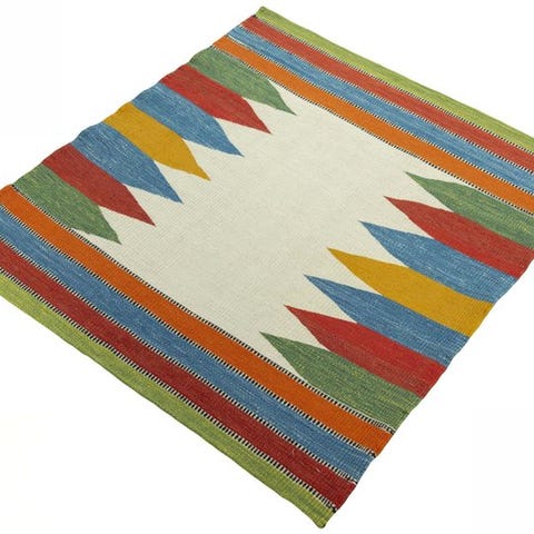 Oprindelse Tyrkiet; Model: Håndvævet Designer Kelim – Samlerstykke; Mål: 105 × 98 cm; Materiale: højkvalitets uld; Håndvævet. Klik på den blå "gå til varen" knap, for at købe eller byde på denne vare. Den samlede pris vil blive vist inden du afgiver dit bud.