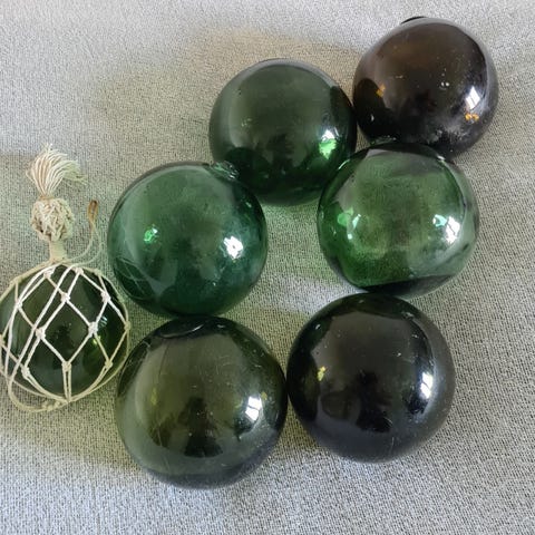 Antikke fiskerkugler, /flydekugler fra fiskeri Holmegaard glasværk, Der er 4 stk glaskugler de fleste i originalt net