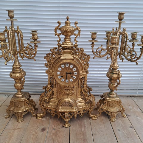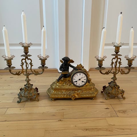 Trittico ur og lysestager i Luigi Filippo-stil, typisk til mantelhylder ved pejsen.