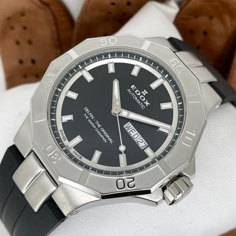 Edox Delfon The Original Chronograph, reference 10112-3NM-NIN, herre-ur afrustjid chronograf i rustfrit stål, 43 mm diameter, sort skive, safirglas, originalt stålrem, ny tilstand, originalkasse inklusiv, original garanti inklusiv, forsendelse forsikret. Klik på den blå "gå til varen" knap, for at købe eller byde på denne vare. Den samlede pris vil blive vist inden du afgiver dit bud.