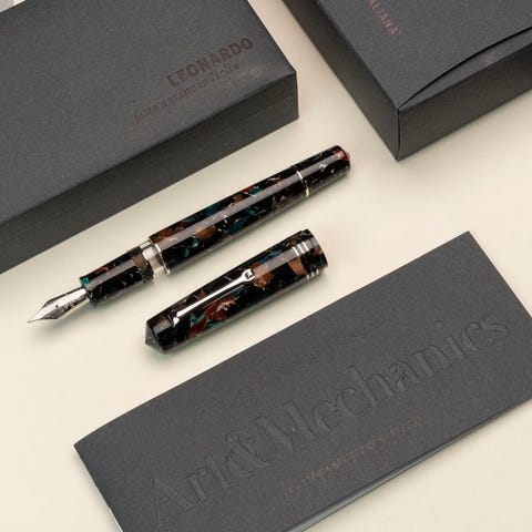 Penne ne er lavet i kostbar italiensk klar resin med makulering, et valg der ikke er tilfældigt: den lyse farve med sine nuancer og årer vækker renhed, mental klarhed og dyd, i overensstemmelse med stoiske principper om moralsk integritet. Den italienske resin sikrer desuden en fremragende kvalitet med en elegant og holdbar finish.