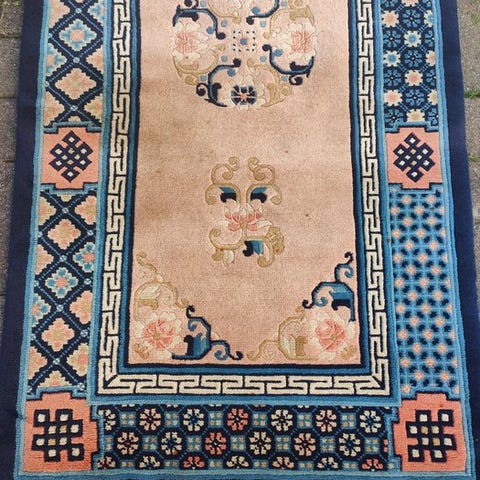 Oprindelsesland Cina, Model Pekino Cina; cremefarvet tæppe vævet af uld og bomuld, 182 x 90 cm, i god stand. Klik på den blå "gå til varen" knap, for at købe eller byde på denne vare. Den samlede pris vil blive vist inden du afgiver dit bud.